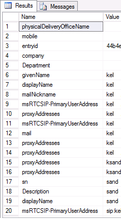 Address book data is stored in the RTCab database, however, the actual data is spread amongst multiple tables. The data I was interested in for this case is in the dbo.AbAttributeValue table. I started with the following query to find out what the UserID for this particular user is: