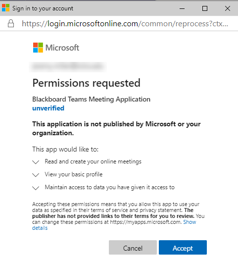 - This allows the Blackboard Teams Meeting app to read and create online meetings on your behalf